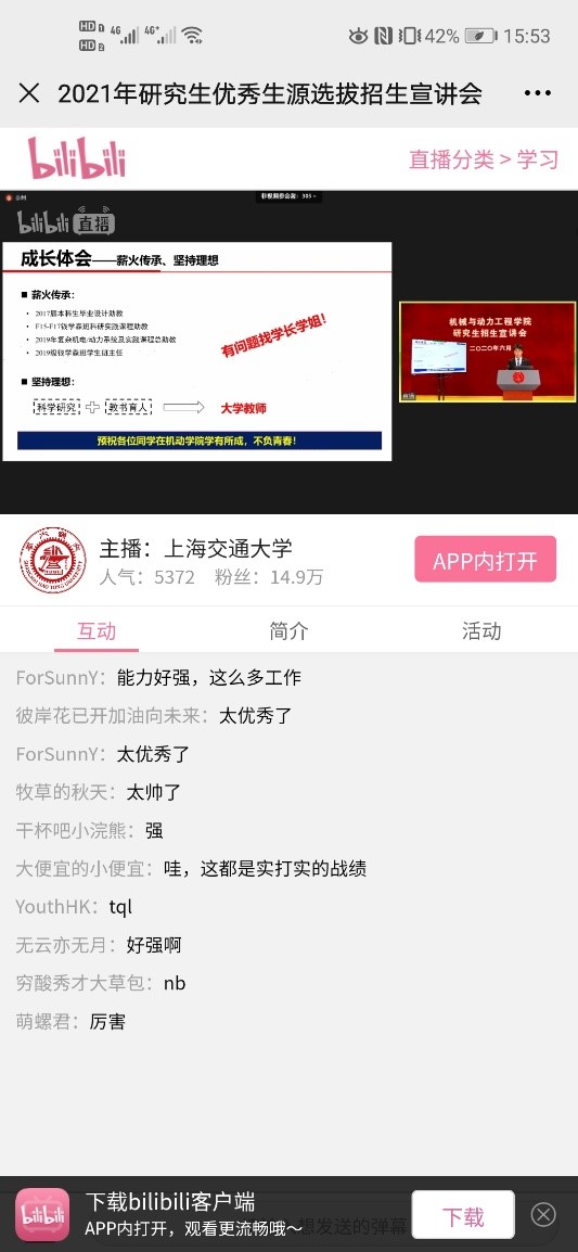 通过ZOOM及直播平台数据显示,ZOOM会议系统500余名学生现场参会,B站实时在线人数峰值达6571人、抖音实时在线观看人数达2918人,各平台累计观看人次超过4万,学院研究生招生云端宣讲会引发了高人气的观看与关注。