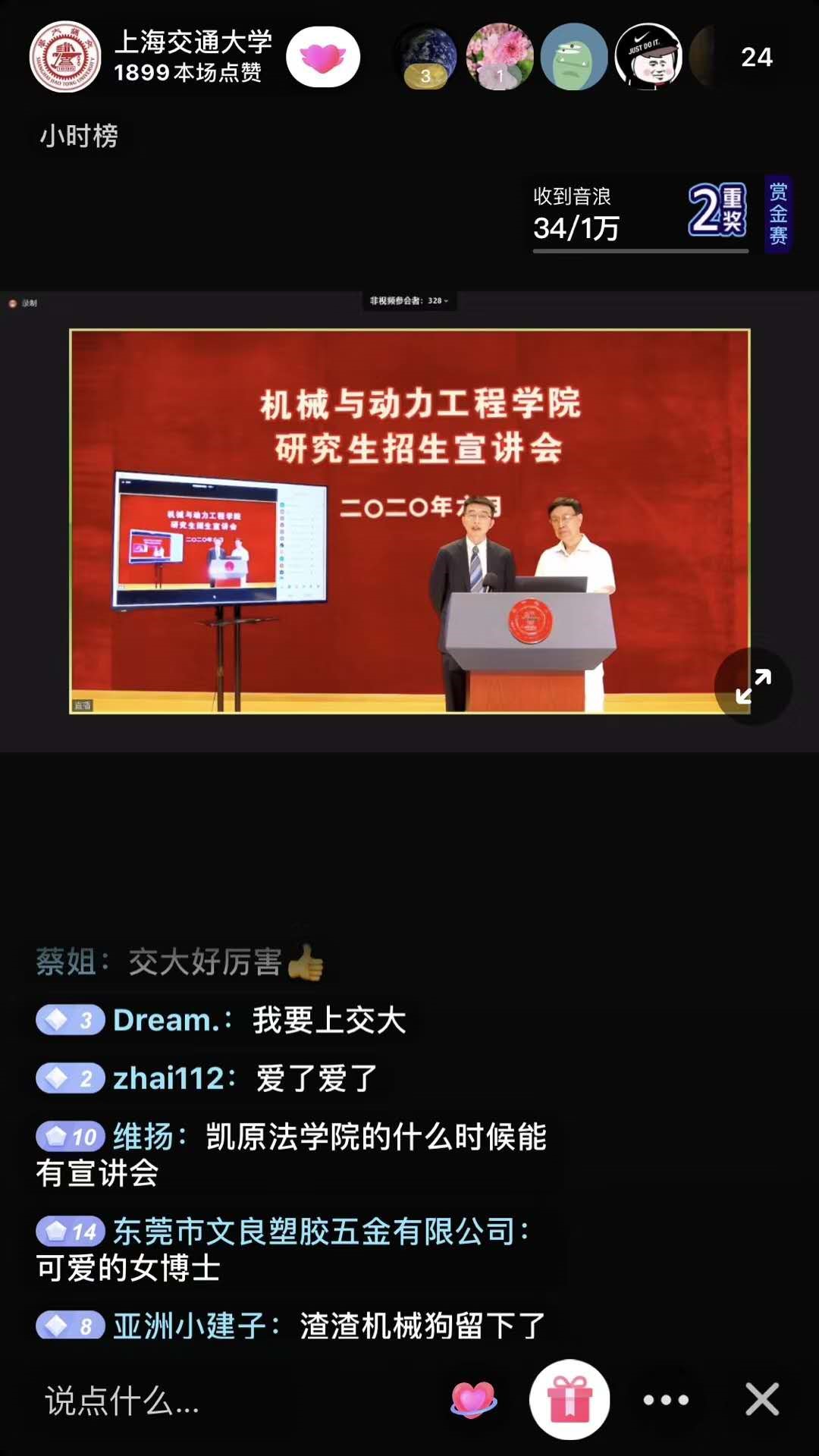 杜朝辉致欢迎辞,欢迎全国各地优秀学子齐聚云端,并诚挚邀请大家在疫情结束后到学院来切身感受学院的魅力。彭志科以“筚路蓝缕、再创辉煌”为主题,向广大学子做院情介绍,详细介绍了学院的百年历程、组织架构、师资队伍、科学研究、研究生培养等情况。来新民、王如竹、顾汉洋、潘尔顺先后就四个学科的学科架构、导师团队、实验室资源及学术前沿方向进行了全面又详实的介绍。熊振华对2021年研究生优秀生源选拔、致远荣誉计划直博生夏令营等研究生招生政策进行了详细解读。王紫璇以“我的直博经历交流分享”为主题,展示了一名女博士生“巾帼不让须眉”的风采,尹念以“成长与坚持”为主题,分享了自己一路奋斗升级成长的所感、所思与所悟。在交流互动环节,熊振华与赵晓明就前期收集的最受同学们关注的招生问题进行了集中解答,并与全国各高校学子进行了在线互动。