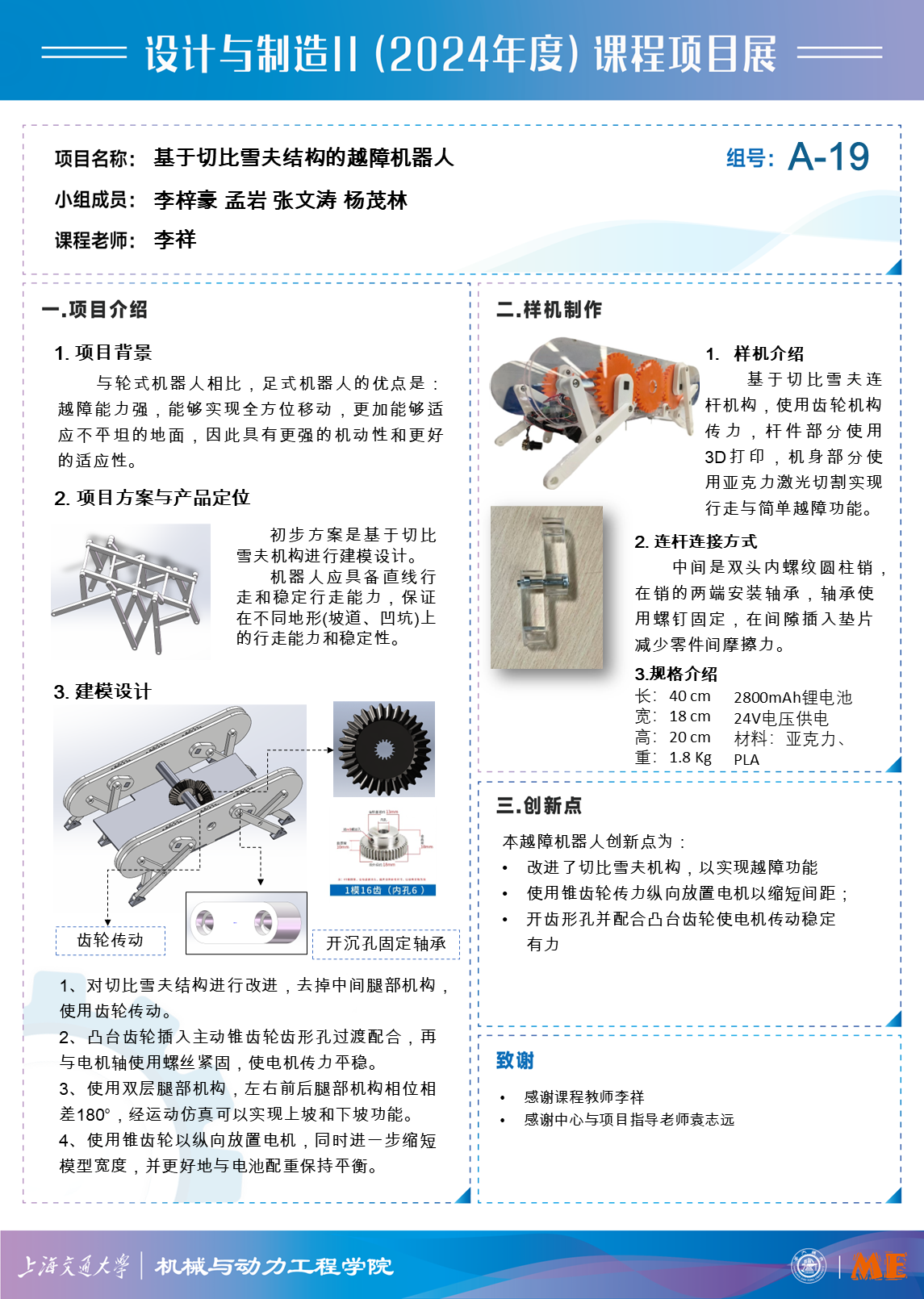 改进了切比雪夫机构,以实现越障功能 使用锥齿轮传力纵向放置电机以缩短间距; 开齿形孔并配合凸台齿轮使电机传动稳定有力