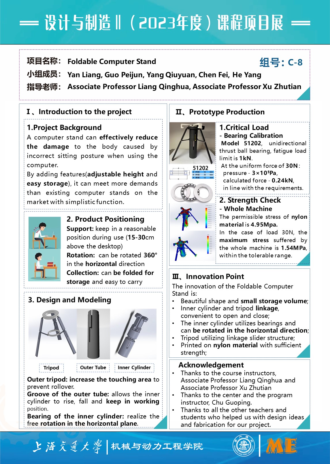 为了实现既定的主要功能目标:灵活调节高度角度、便携可收纳,我们进行了材料选用分析、结构设计、力学校核分析等工作,通过对比不同模型3D建模下受力变形程度,综合考虑用户的使用需求,通过3D打印与金属车床加工等加工方式制造出了最终的产品。