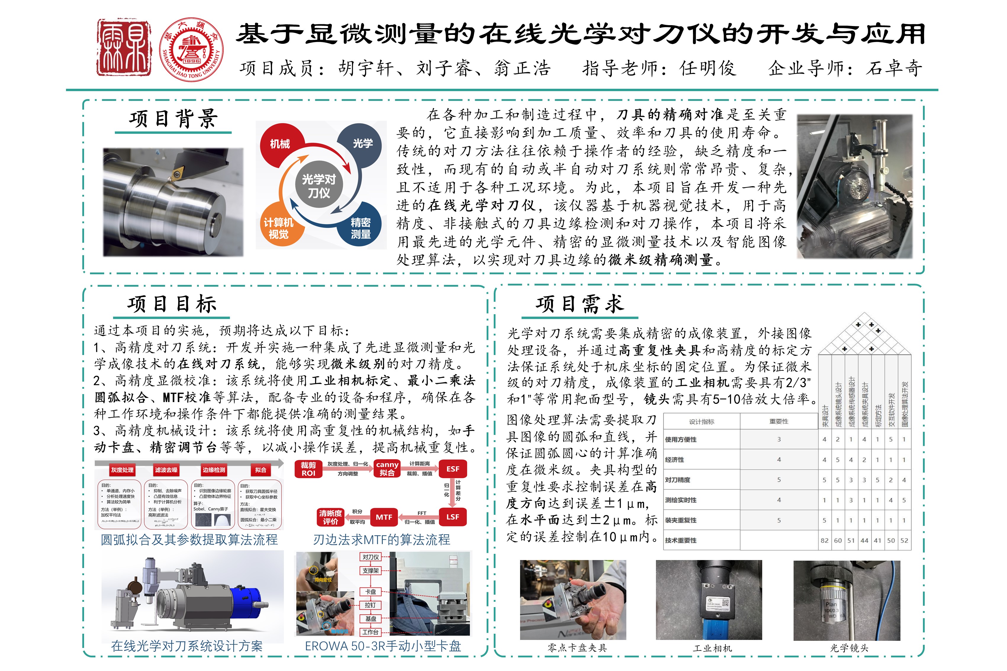 为此,本项目旨在开发一种先进的在线光学对刀仪,该仪器基于机器视觉技术,用于高精度、非接触式的刀具边缘检测和对刀操作,本项目将采用最先进的光学元件、精密的显微测量技术以及智能图像处理算法,以实现对刀具边缘的微米级精确测量。