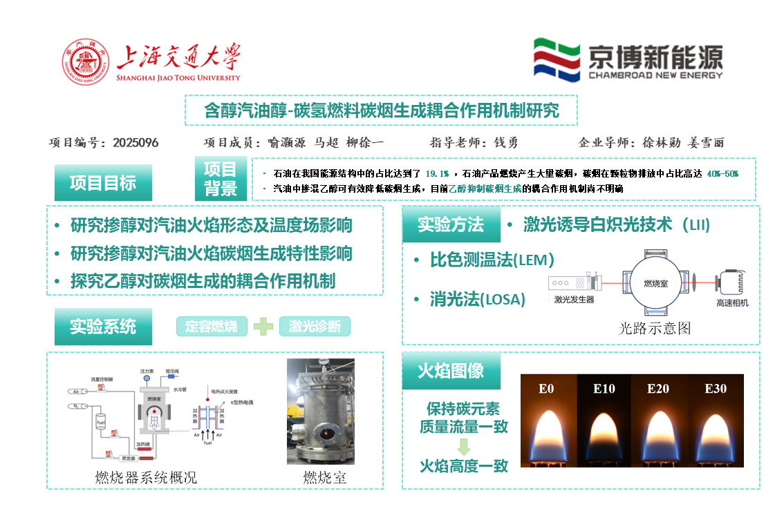 化石燃料在如今乃至未来很长一段时间内仍将占据全球能源结构的主导地位,而对其过度依赖正在加剧气候变化与空气污染,能源危机迫在眉睫。乙醇燃料因其可再生、低排放等优势被广泛应用于化石燃料掺混中,用于改善燃烧质量和减少污染物排放。但目前掺混乙醇对汽油火焰特性及碳烟生成特性的影响机制尚不明确,因此本项目通过实验探究了不同压力下不同乙醇掺混比例的乙醇-92汽油混合燃料的燃烧特性,同时通过数值模拟方法探究了乙醇对碳烟生成的作用机理。