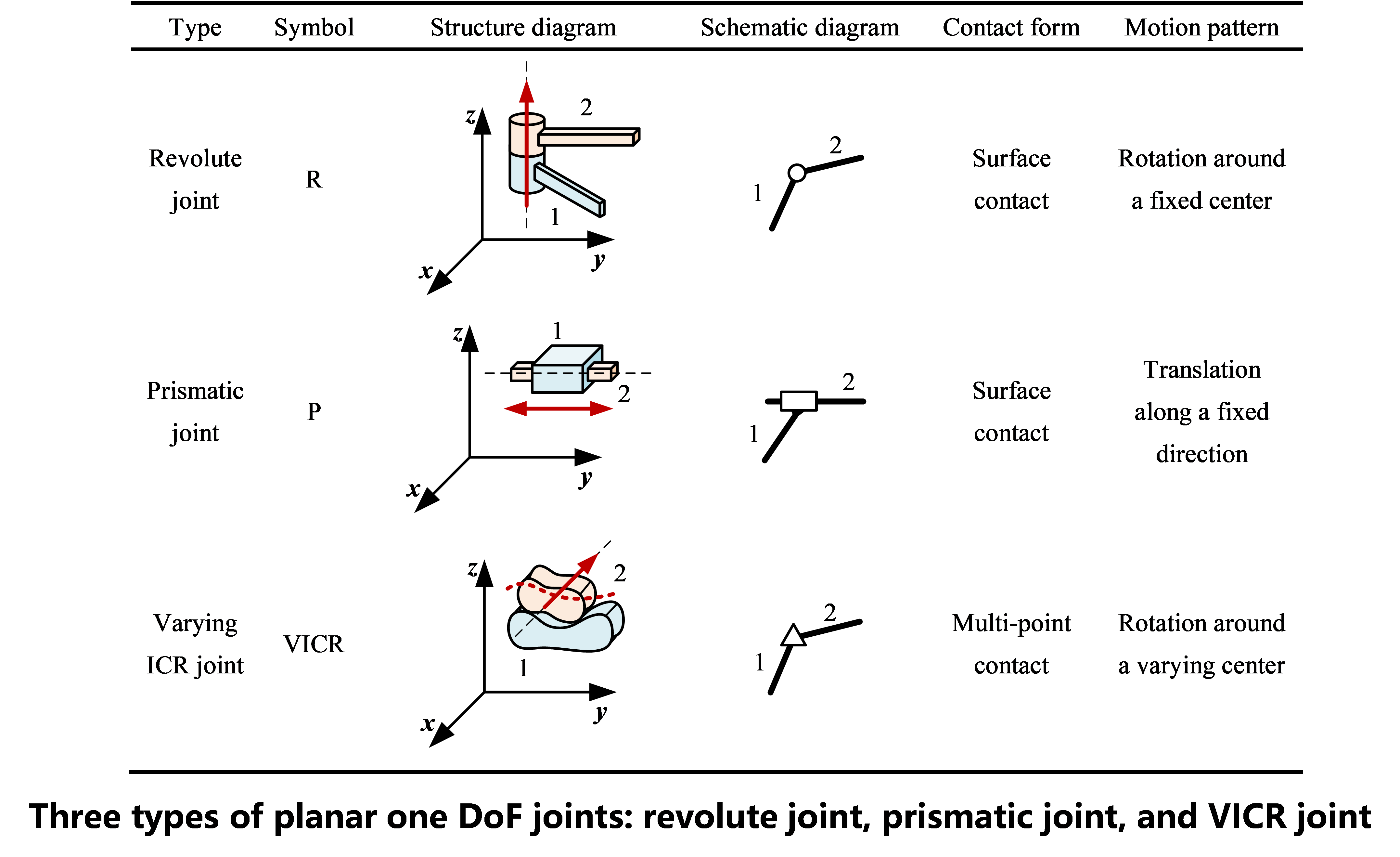 Based on the established biomimetic joint design method, the team proposed a new concept for the VICR joint. This novel joint is designed with the core concept of “multiple contact points + one DoF motion”. Through the geometric design of the elemental profiles, the VICR joint achieves complex motion with a varying ICR while maintaining only one DoF, offering both structural compactness and motion flexibility. Compared to traditional one DoF joints such as revolute and prismatic joints, the VICR joint is capable of accurately reproducing the complex motion patterns of human joints, effectively overcoming the challenges for achieving the complex motion in one DoF joints.