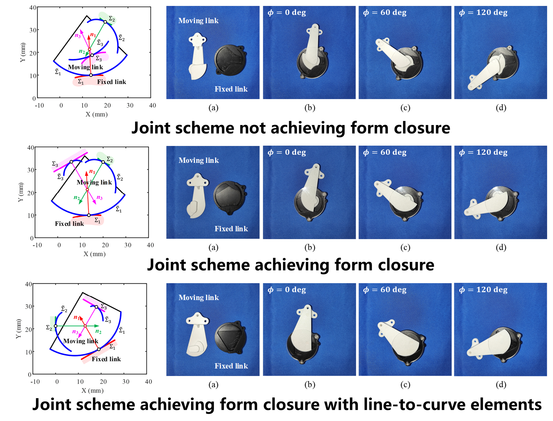 Aiming to address the inherent contact disengagement problem in higher pairs, the team conducted an in-depth study of the form closure principles of VICR joints, proposing three equivalent form closure criteria and demonstrated that “at least three simultaneous contact points are required to achieve form closure for VICR joints with two-dimensional plane motion”. Based on this, the team developed a visual analysis method for joint closure space, providing a systematic basis for predicting and ensuring joint closure at the design stage.