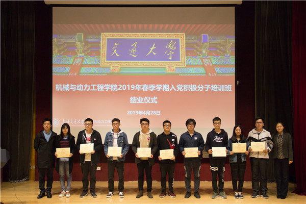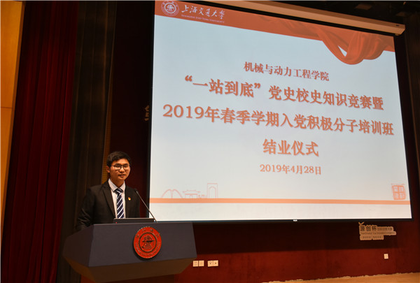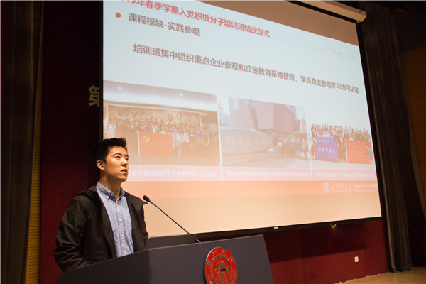 梁茂宗对2019年春季学期入党积极分子培训班的情况进行了总结。本期培训班共包含理论基础、参观实践及志愿公益3个模块。经过2次现场专题授课、3门慕课在线课程的学习与3次党理论知识讨论会,各位入党积极分子的理论水平与党性修养都得到了有效的提高;而中共一大会址、秦山核电基地与钱学森图书馆等爱国主义教育基地的参观学习活动更是让同学们对我们党艰苦而光荣的奋斗历程、对马克思主义在当代中国的蓬勃发展有了更深刻的理解。在刚刚过去的校庆期间,学员们还自发地承担起志愿者的任务,活跃在台前幕后各个角落,在实践中检验所学知识。